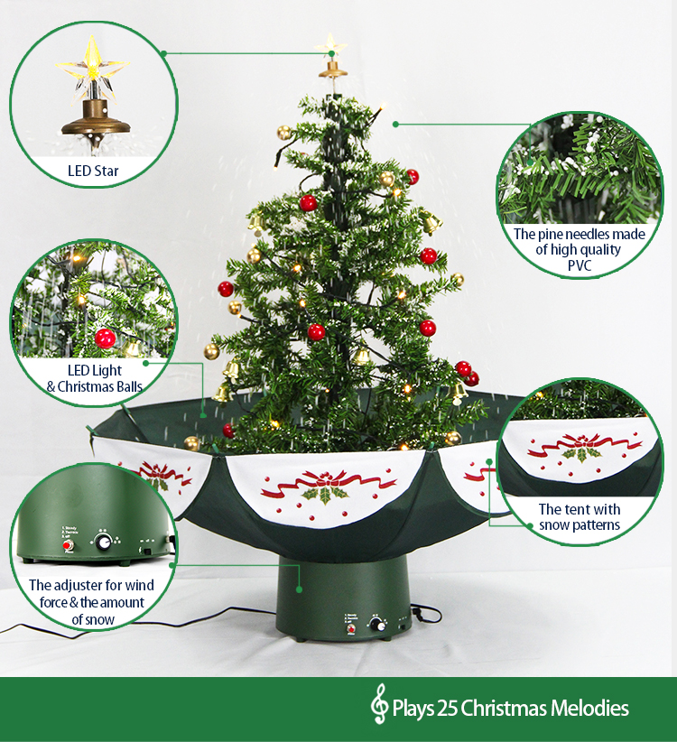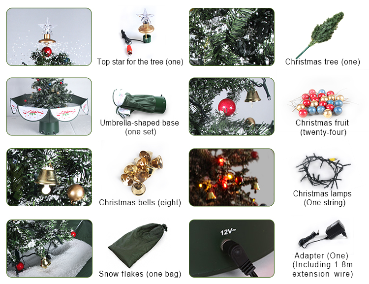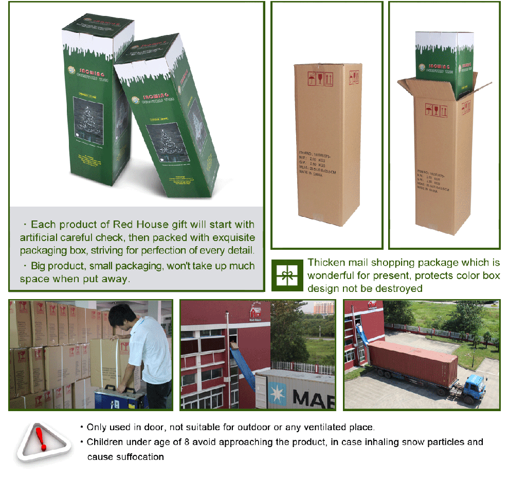 | 7)Brief introduction | Rainproof structure, IP23 level. Features with snowing, lighting and musical. 5.5m wire, long enough to connect main electricity from indoor. |