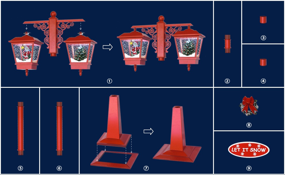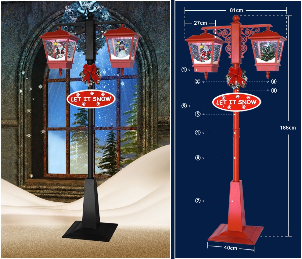 | 6) Color | Colorful santa claus and tree inside, red lamp cap and green lamppost. |
